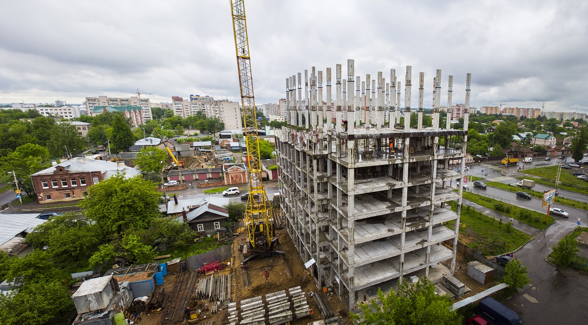 На ул. Большой Воробьевской в г. Иваново монтируют настил 8-го этажа и одновременно устанавливают колонны 4-го яруса строящегося жилого комплекса.